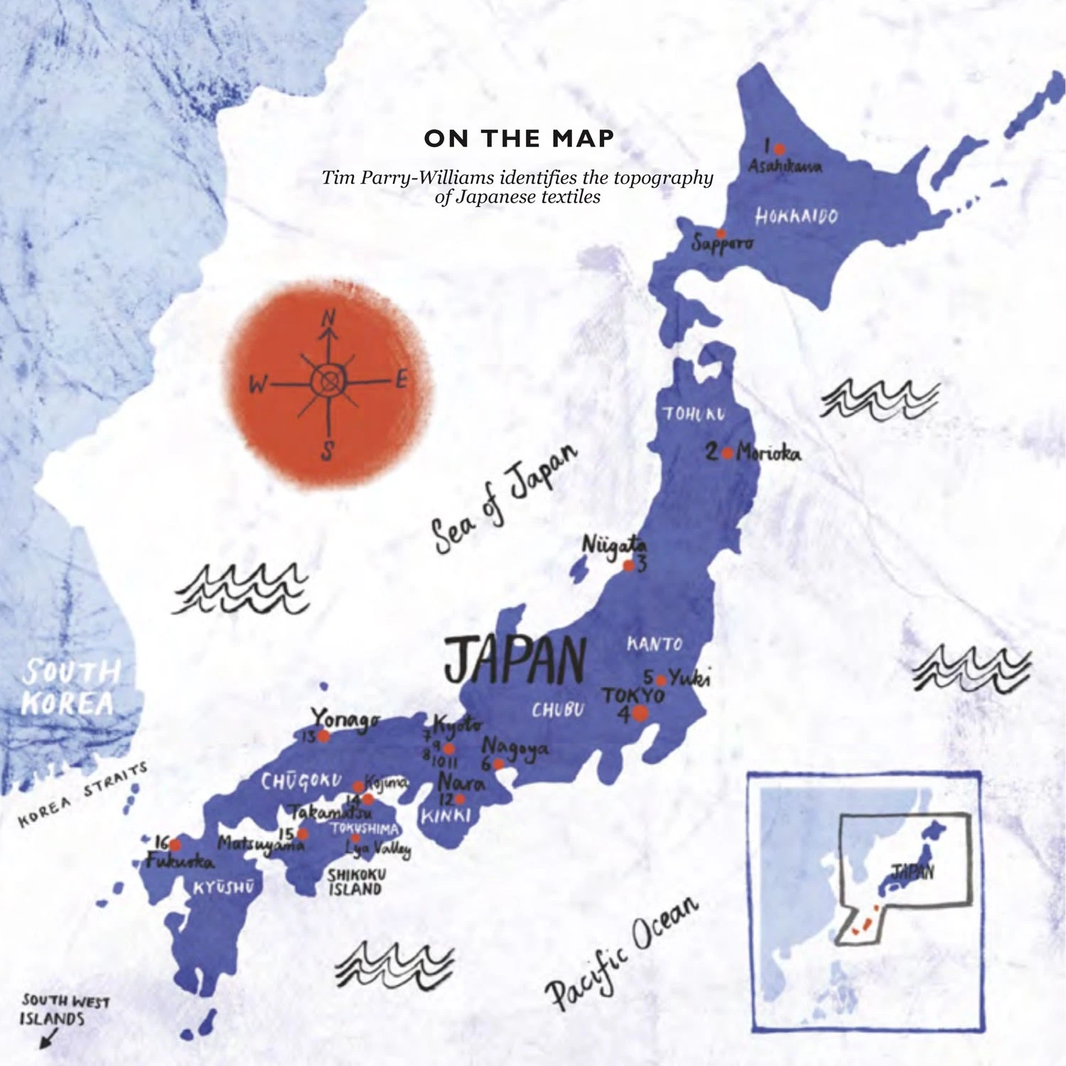 ‘Typhoon Lan obliterated the Naruto whirlpools during my visit to Tokushima last October. While so much of Japan suffered devastating loss as a result of the storm, in fact, it is due to the frequent typhoons and subsequent flooding of the Shinmachi River that prevent rice paddies from being sustainable in the region, allowing indigo, harvested before the typhoon season, to take hold. This lead to Tokushima becoming the centre of the indigo trade in the 19th century and home to wealthy indigo merchants. Today it is the undisputed indigo capital of the world.