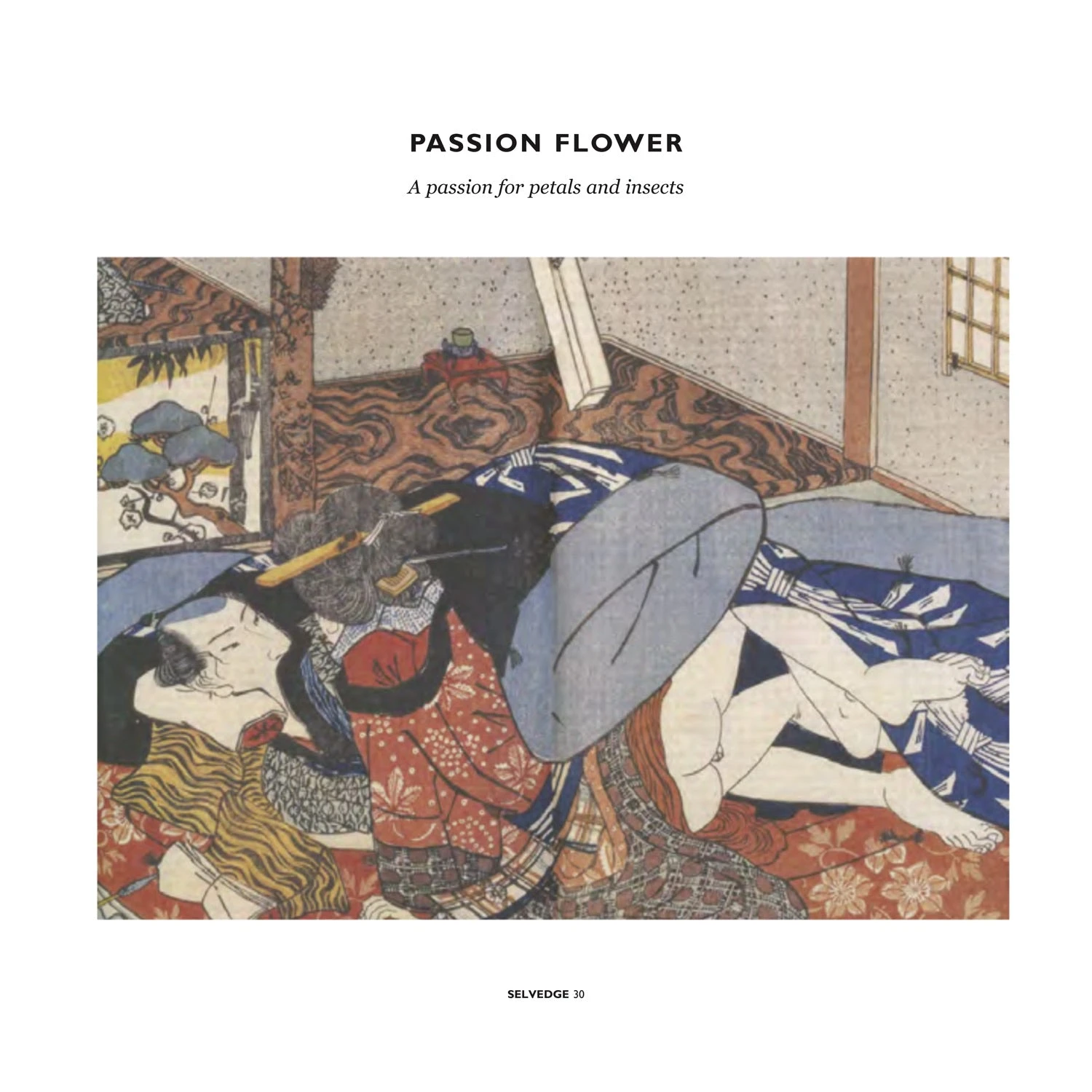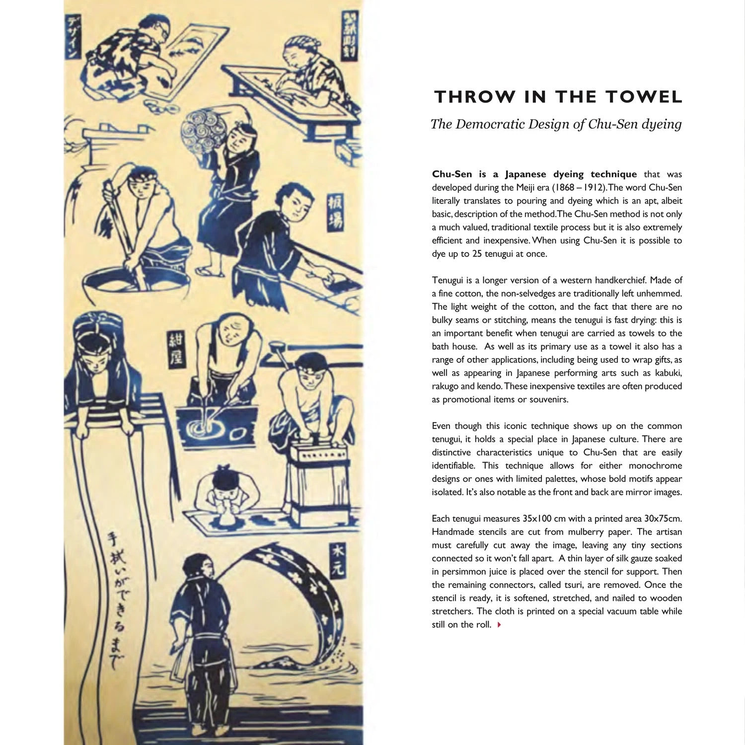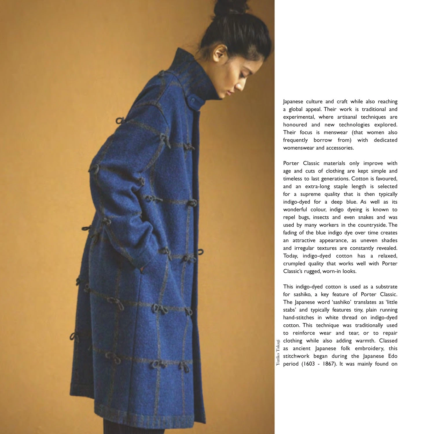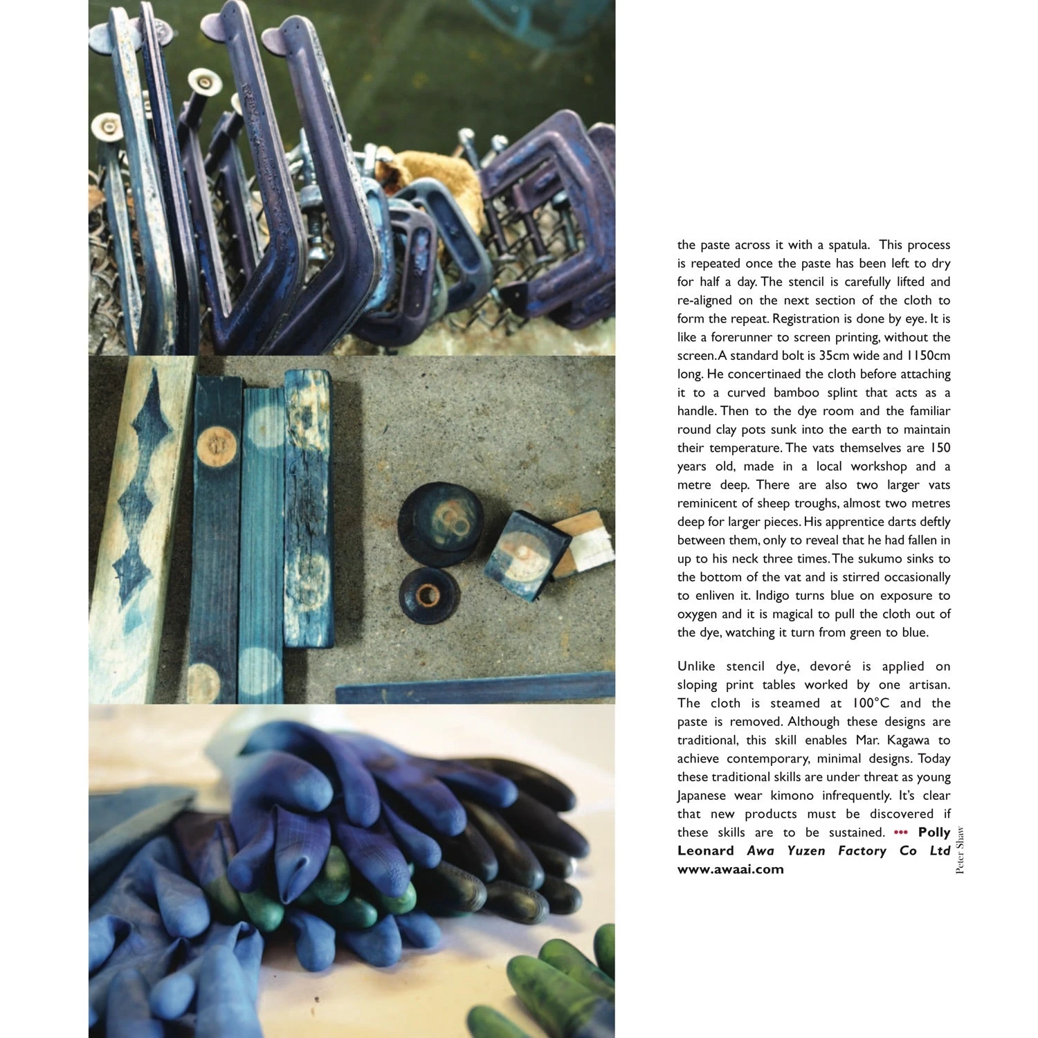 My itinerary introduced me to the cult of the craftsman at the Awa Yuzen atelier. With great patience I was shown stencils in constant use for 200 years, and tried my hand at paste resist as a young assistant darted between the vats, only to reveal he had in fact fallen in twice during his apprenticeship. We then moved to Nagao Orifu, where the sounds and smells were familiar and I was struck by its similarity to the woollen mills of Yorkshire. Then to Okamoto Orifu Factory, where master craftsmen are working to satisfy the world’s hunger for Japanese selvedge denim, weaving on old Toyota looms, rope-dying his cotton and contrasting their indigo with persimmon. Finally, to conclude my visit, to Mr Sato; who together with the half dozen or so Water Masters maintains the sukumo tradition that makes Japanese indigo darker and more intense than anywhere in the world. In this issue, we celebrate Japan Blue and the country’s rich textile culture.’