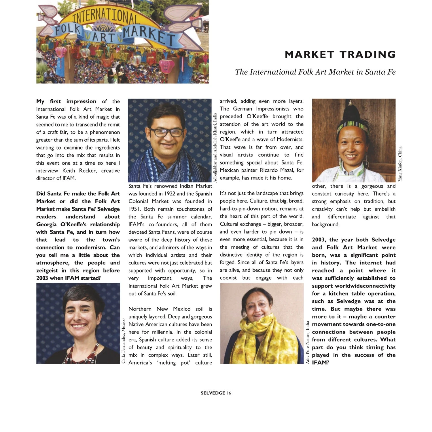 In the issue, we visit New Mexico’s key sights with the Alexander Girard Folk Art collection and the wardrobe of Georgia O’Keeffe. We also celebrate the work of artisans who will be exhibiting at the Selvedge World Fair in London, including Porfirio Gutierrez from Mexico and Bhairvi’s Chikan from India. Also in this issue, we explore the ideas around cultural appropriation, as well as the British tradition of Morris Dancing. In the more immediate future, we will be visiting Bath again on 30th March and I hope to see you there.