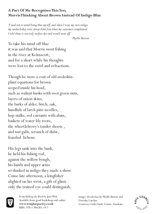 Jane Weir (b. 1963) is an Anglo‑Italian writer, designer and poet whose work bridges craft history and lyric imagination. Winner of the Wigtown Poetry Prize and celebrated for her sensitive textual portraits, she is the author of Walking the Block (2008) and Spine (2012) — poetic biographies that explore textile-making figures through archival empathy. A contributor to Selvedge, PN Review and Faber anthologies, Weir’s work is deeply rooted in material culture and language-as-structure.