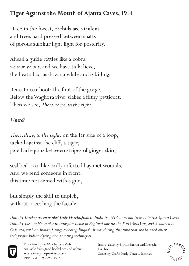 Walking the Block is a poetic biography that resurrects the creative partnership of Phyllis Barron and Dorothy Larcher—the pioneering modernist hand‑block printers who brought colour, craft and quiet rebellion to interwar textile art. Jane Weir weaves narrative and material history, tracing their journey from Brook Street Gallery beginnings through Indian dye practices and wartime commissions for clients like Coco Chanel, Winchester Cathedral, and Girton College. Each page is infused with rhythm: the literal “walking” of carved blocks, the dyeing of wild madder, and the women’s shared dialogue in cloth and technique.